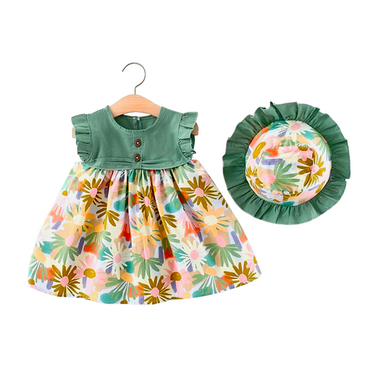 Kids Girl Frock Set With Hat, Floral Pattern, Colorful Green, Toddler, 6 month - 36 Month