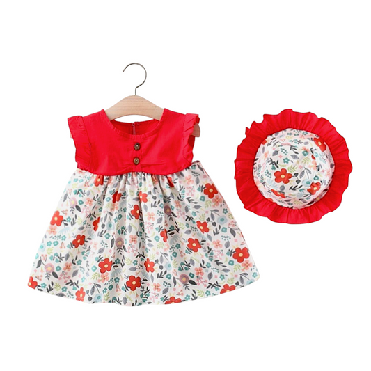 Kids Girl Frock Set With Hat, Floral Pattern, Red, Toddler, 6 month - 36 Month
