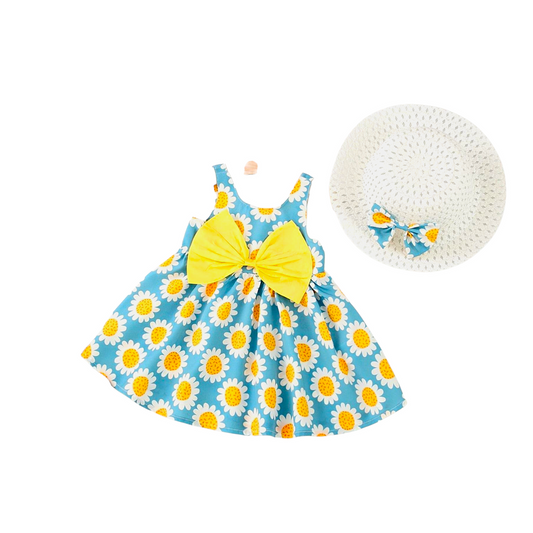 Kids Girl Frock Set With Hat, Floral Pattern, Flower Blue, Toddler, 6 month - 36 Month
