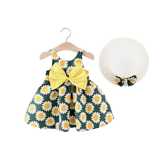 Kids Girl Frock Set With Hat, Floral Pattern, Green Floral, Toddler, 6 month - 36 Month