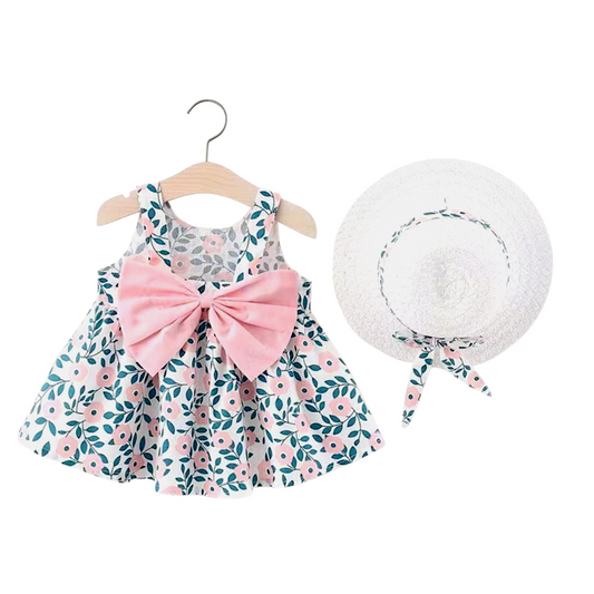 Kids Girl Frock Set With Hat, Floral Pattern, Colorful Pink White, Toddler, 6 month - 36 Month