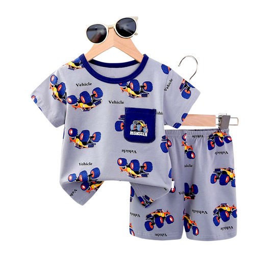 Kids Co-ord set Cartoon Printed Round Neck, Monster Truck Grey, Toddler, Age 1 -6 year