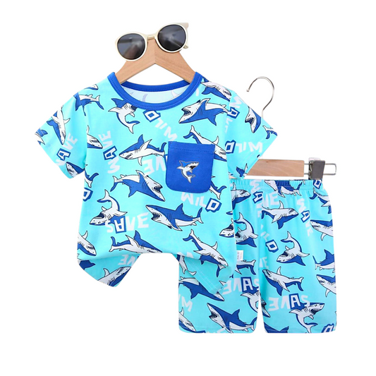 Kids Co-ord set Cartoon Printed Round Neck, Shark Cyan, Toddler, Age 1 -6 year