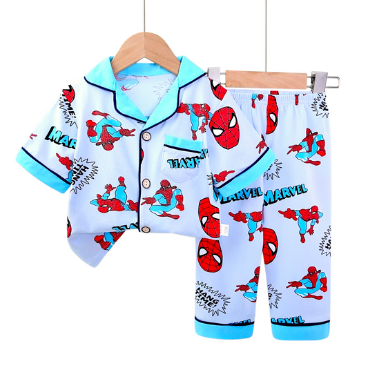 Kids Night Suit Wear set Cartoon Printed Collar Neck, Spiderman Cyan, Toddler, Age 2 - 10 year